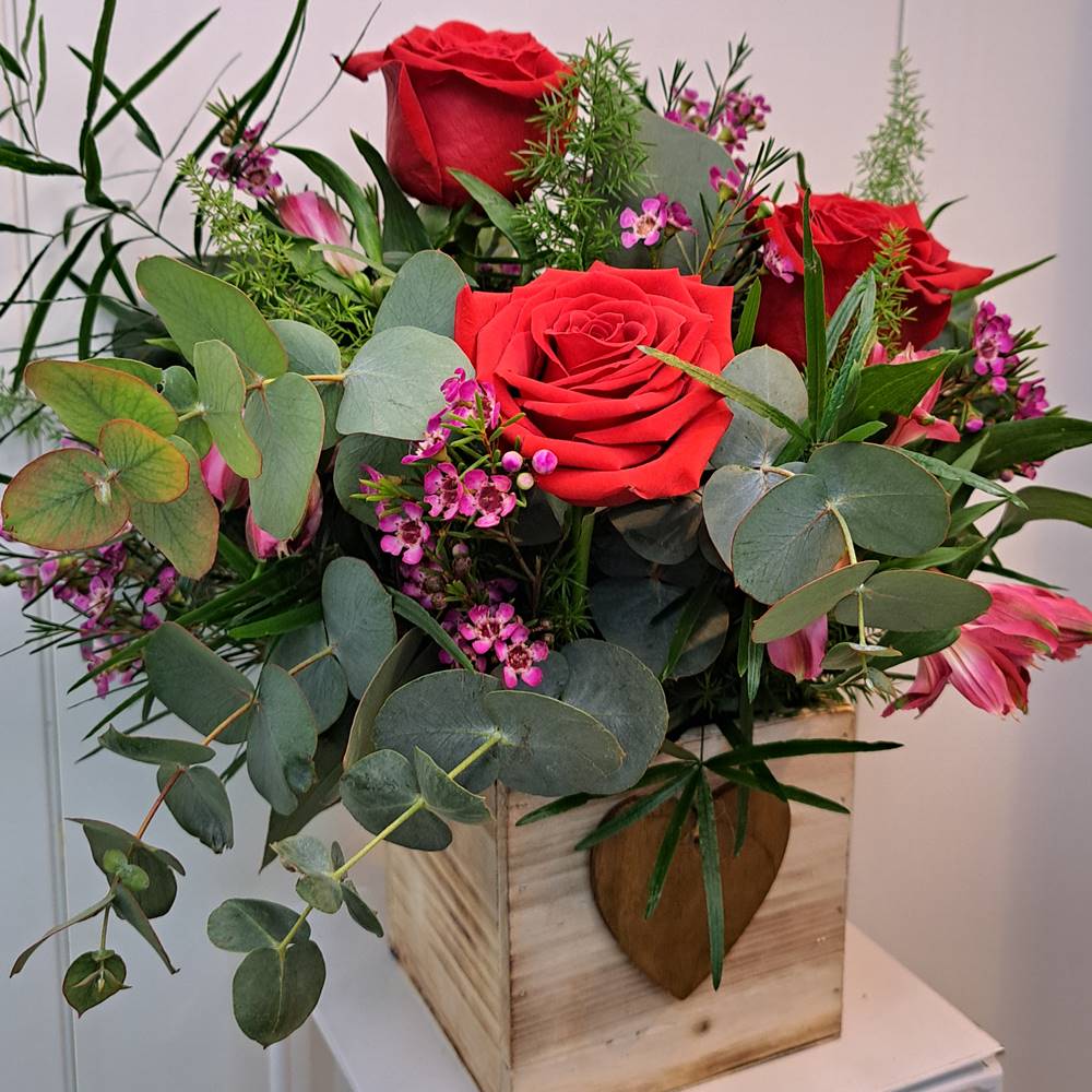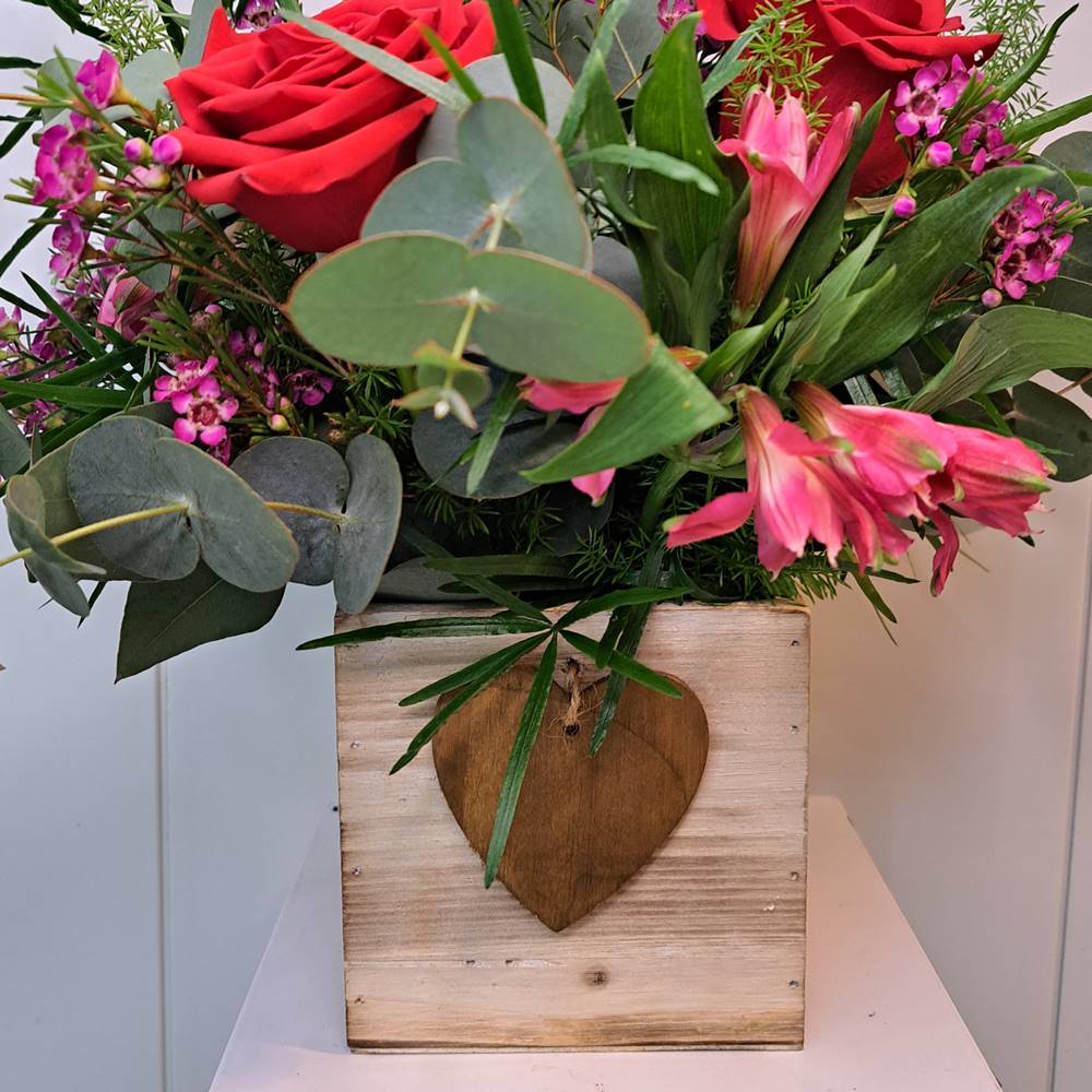 Expresa tu amor con Amore, un encantador centro floral diseñado sobre una elegante base de madera cuadrada de 12×12 cm. Su detalle especial, un delicado corazón de madera, lo convierte en el regalo perfecto para San Valentín, aniversarios o cualquier ocasión romántica.