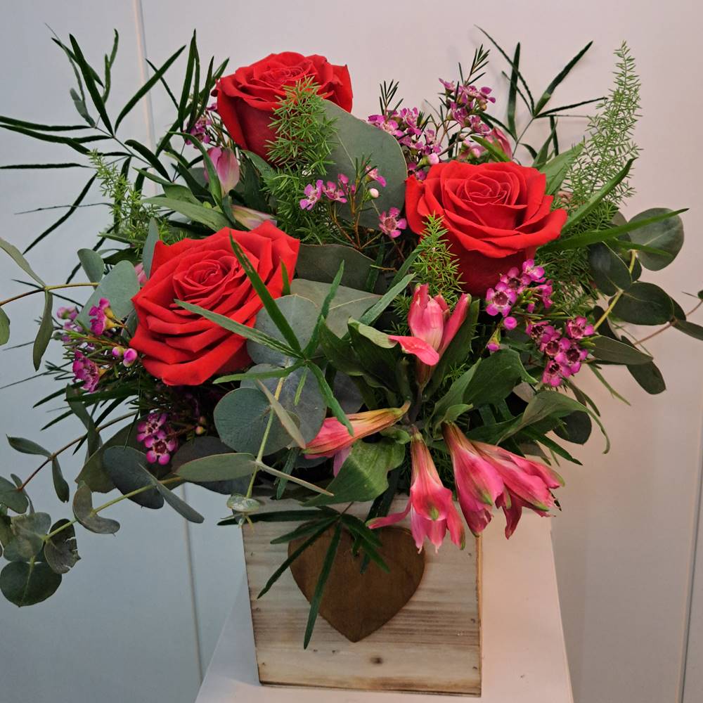 Este diseño combina 3 rosas rojas, verdes variados de temporada, flor de cera rosa y alstroemerias rosa, creando una composición equilibrada entre pasión y ternura.