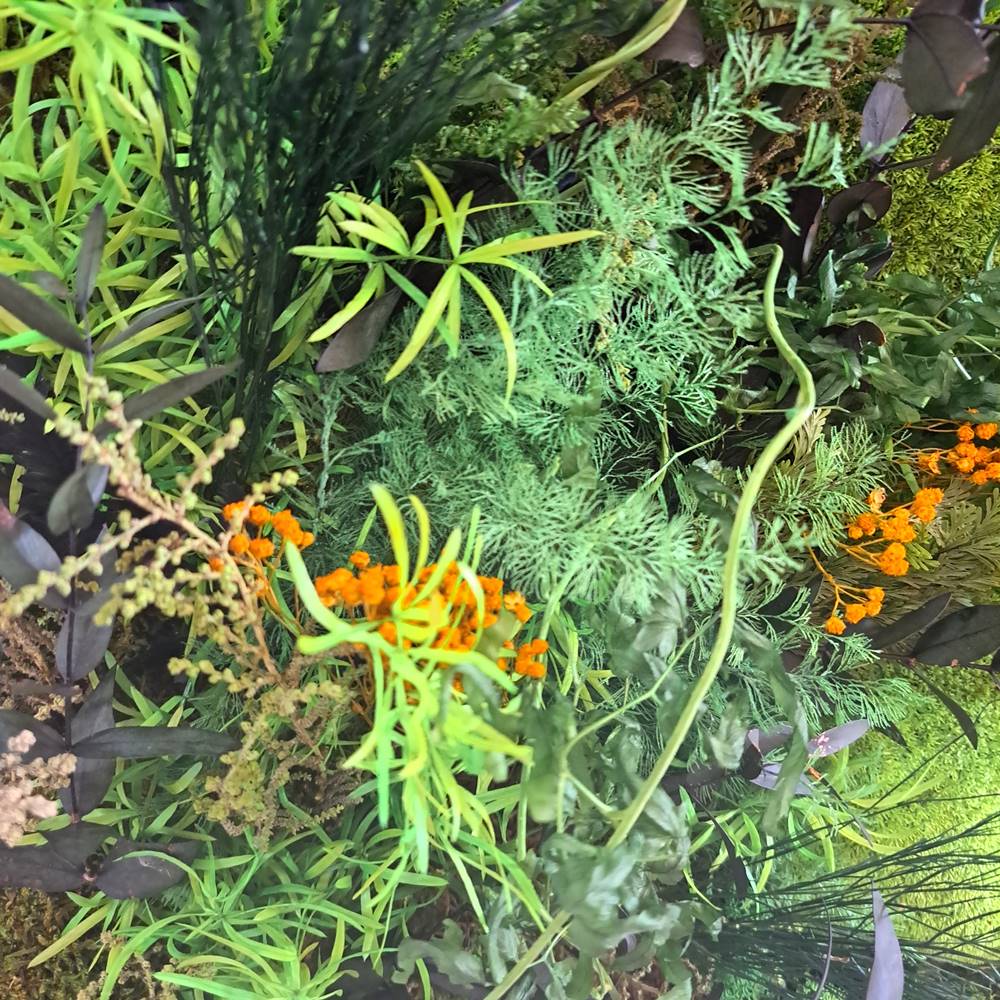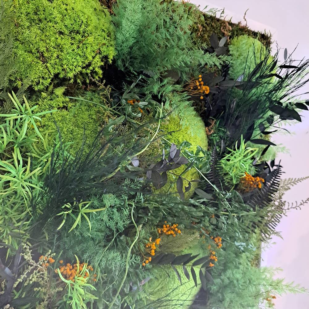 Nuestros jardines y cuadros verdes ofrecen la belleza del aire libre y la naturaleza en el corazón de tu espacio interior. Los jardines verticales de plantas naturales son preciosos pero requieren de mucho mantenimiento y condiciones concretas; los cuadros verdes preservados realizados con verdes, flores y plantas naturales preservados no requieren agua, ni luz, no atraen insectos, ni requieren abonos ni luces especiales.
