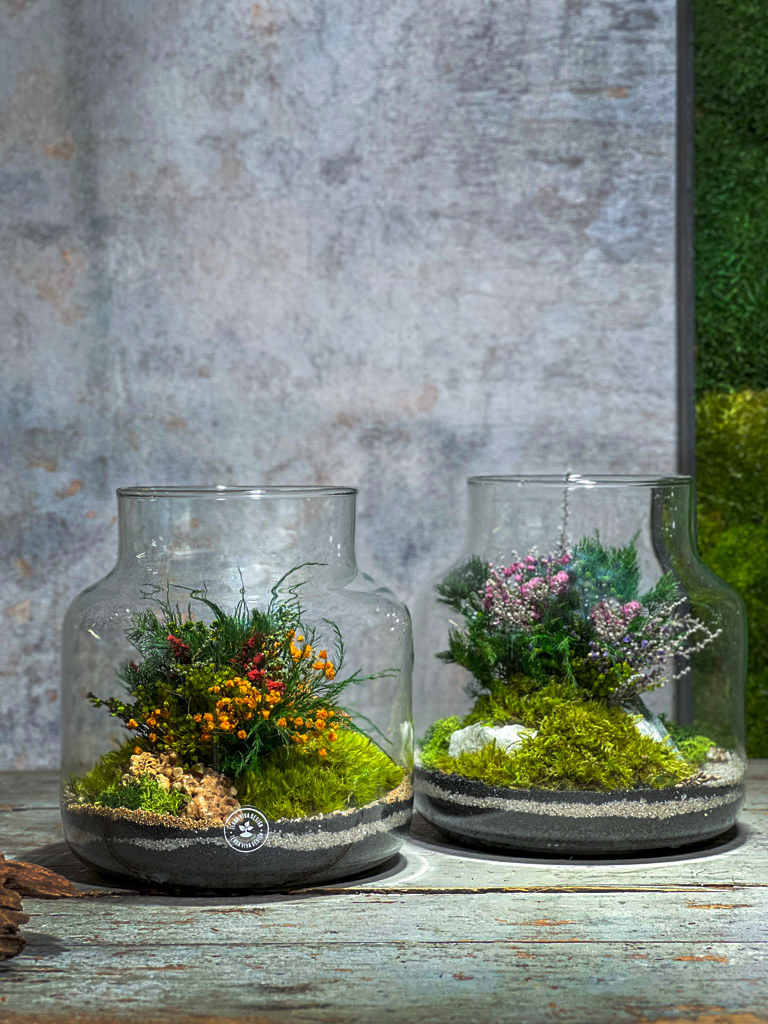 Un auténtico terrario, hecho de plantas preservadas, mantiene su apariencia fresca sin necesidad de agua ni luz.