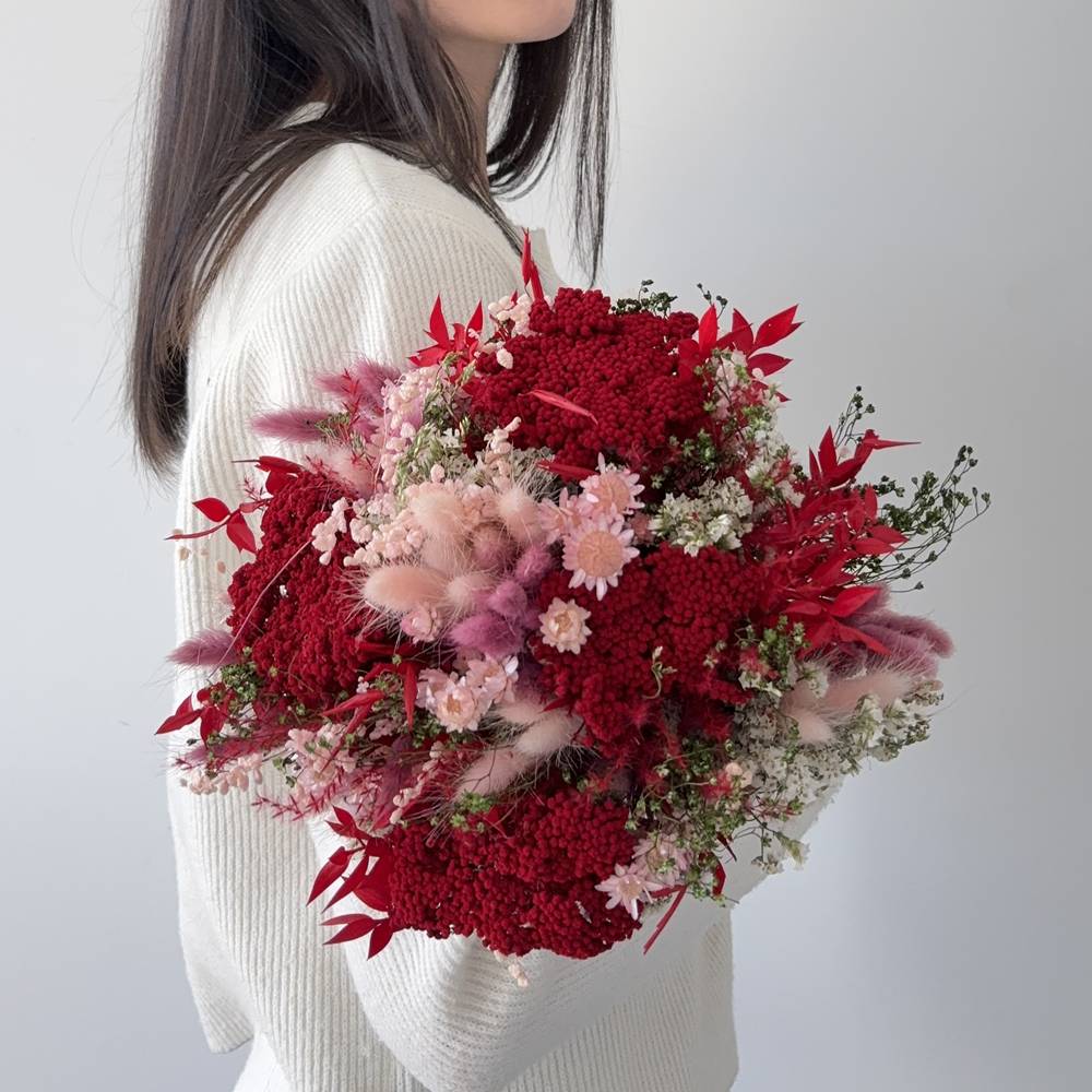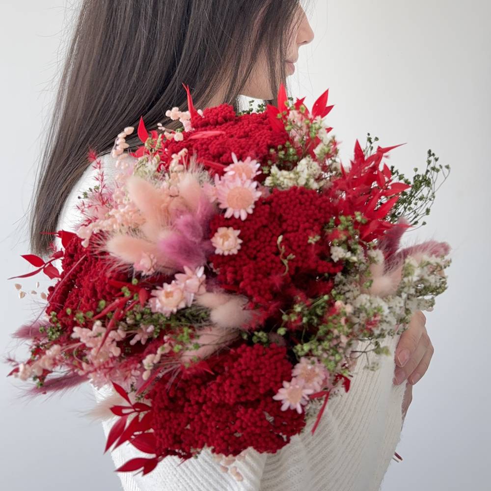 Si buscas un ramo que combine fuerza y dulzura, Bihotza es el elegido. 💖 En tonos rojos, rosas y crudos, este ramo de flores secas destaca por su equilibrio perfecto entre intensidad y suavidad. Su composición de achillea, lagurus, avena salvaje y glixia crea una textura única y llena de encanto.