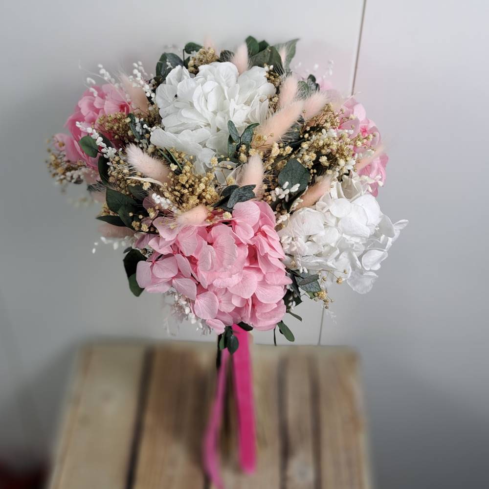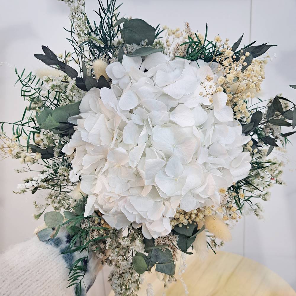 Ramo de flores preservadas compuesto por eucalipto, paniculata, hortensia en tonos rosa claro y blanco roto y flores varias preservadas.