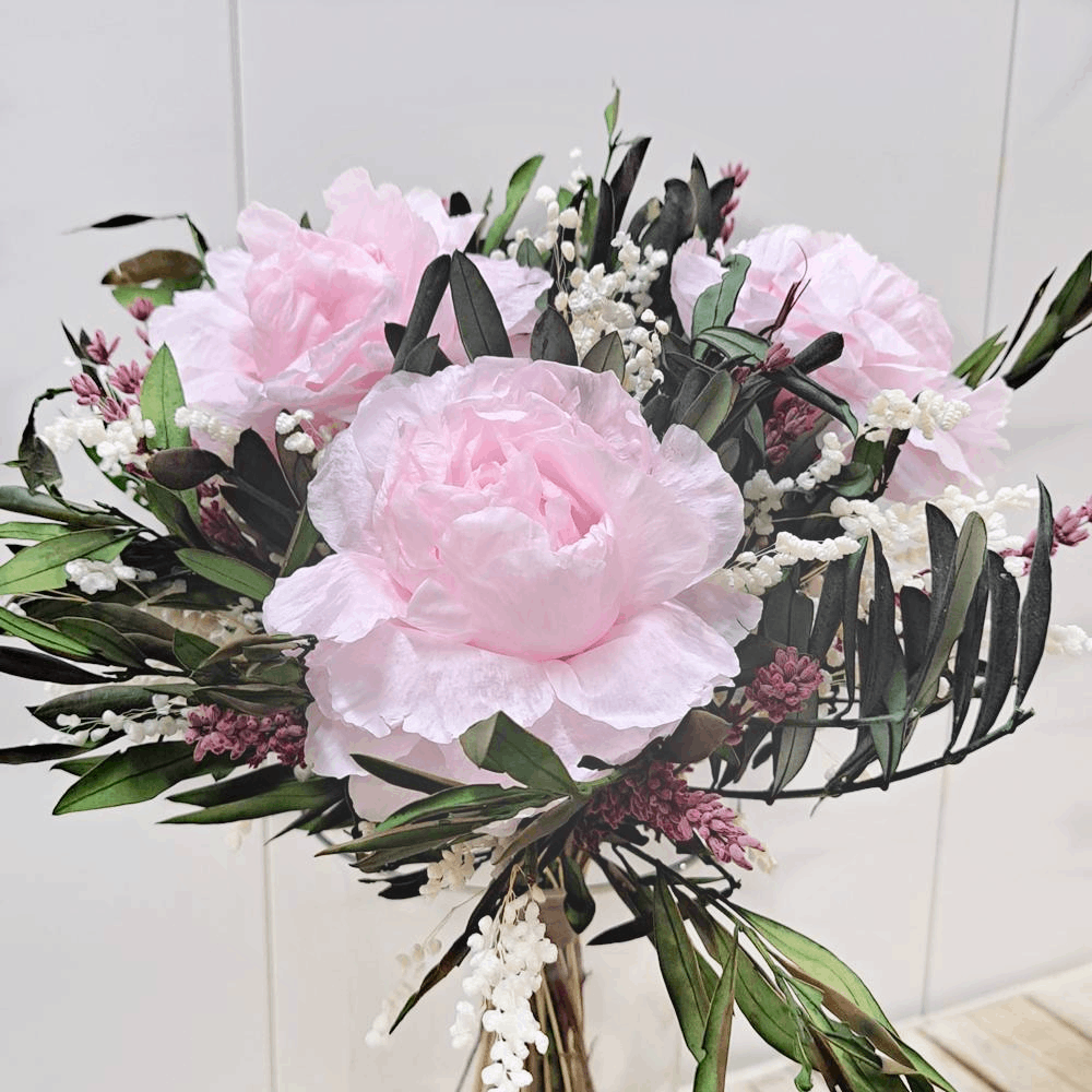 Ramo preservado «Oliba» con peonías rosas y hojas de olivo, combina tonos suaves y un estilo natural perfecto para decorar o regalar.