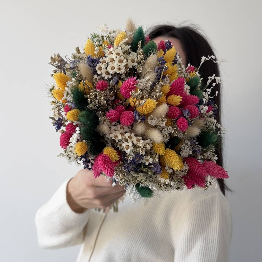 Si buscas un ramo lleno de vida y frescura, Udaberri es la elección perfecta. 🌿🌈 Inspirado en la explosión de color de la primavera, este ramo de flores secas combina phalaris en fucsia y amarillo, lagurus en verde, ixodia y limonium blanco, junto con toques de delphinium morado. Un mix vibrante que iluminará cualquier rincón.