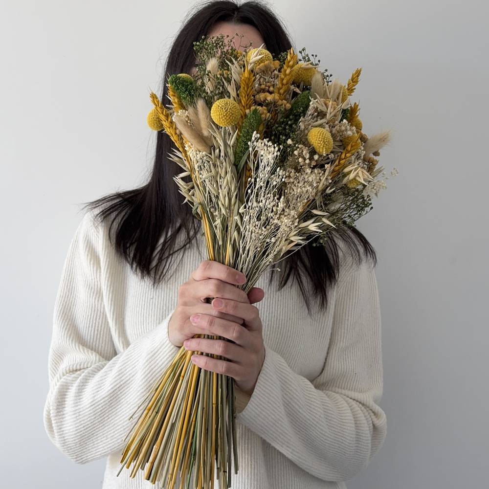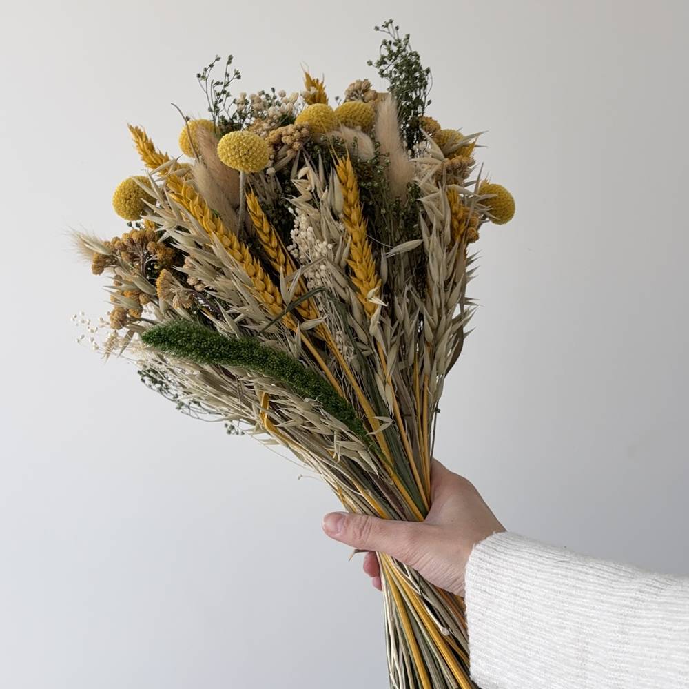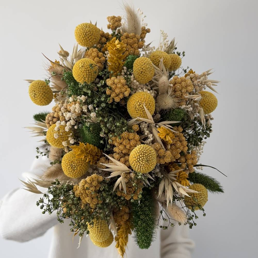 Si te encanta la calidez de los tonos mostaza, amarillos, verdes y crudos, Ziape es el ramo perfecto para ti. ☀️🌾 Compuesto por una vibrante selección de flores secas, como craspedias, avena, trigo, broom, setaria y otras flores, este ramo aporta frescura y alegría a cualquier espacio.