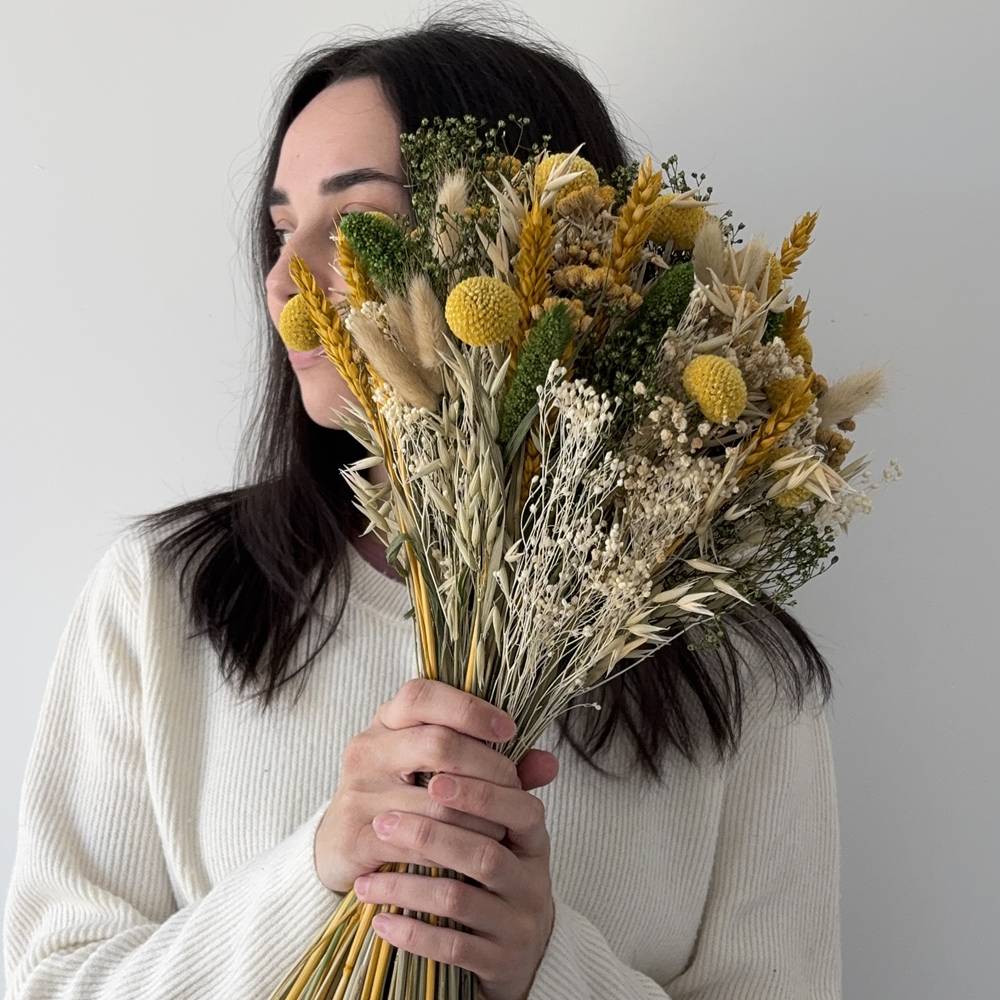 Atrévete a iluminar tu decoración con Ziape, el ramo de flores secas en tonos mostaza y verdes que transmite alegría y frescura sin esfuerzo.