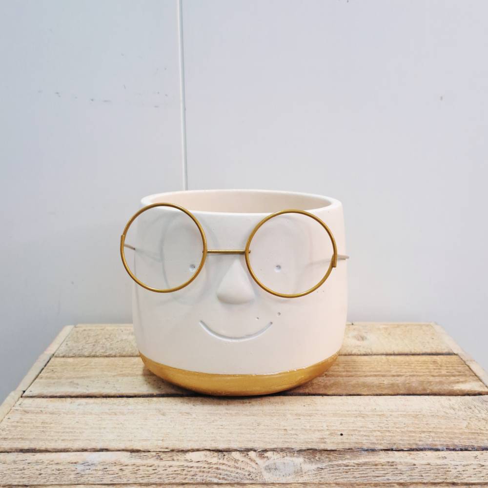 Incluye maceta decorativa de figura con gafas.