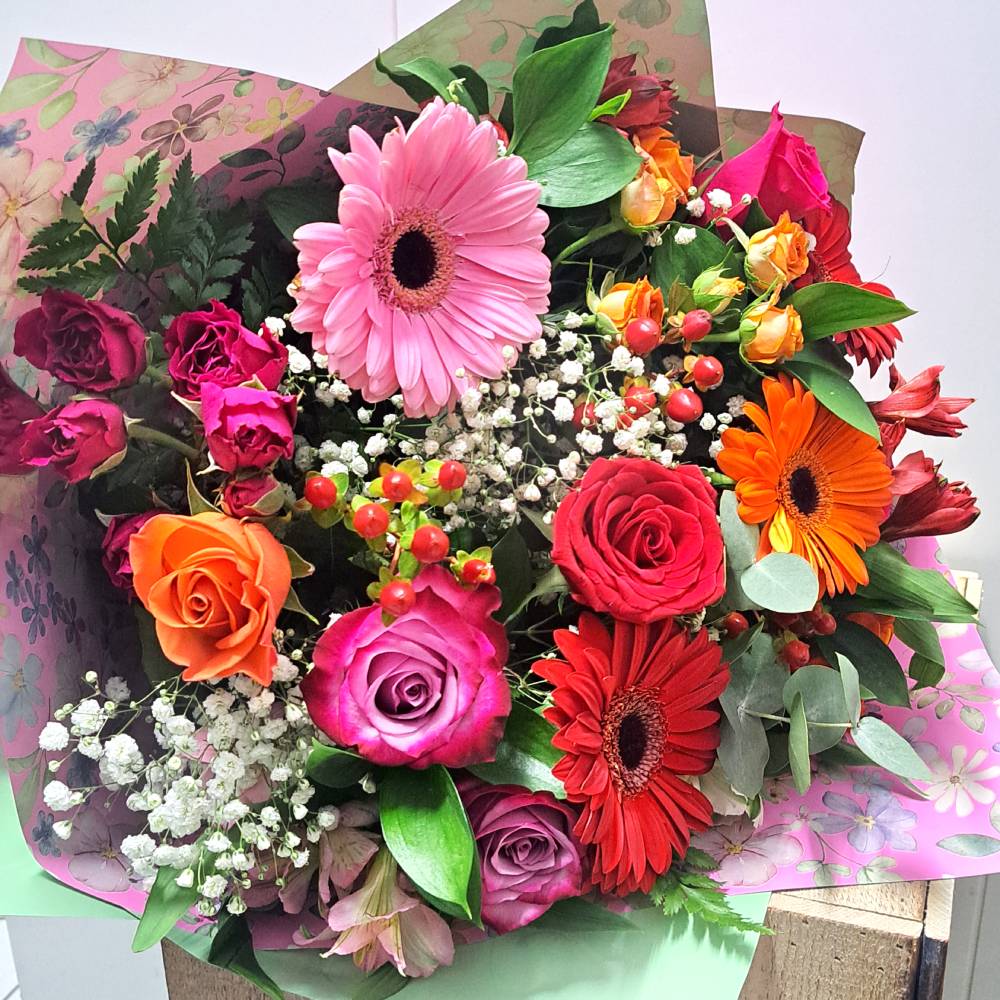 El ramo Alaia combina gerberas, rosas, mini rosas y flores variadas, creando un arreglo lleno de color, alegría y frescura.