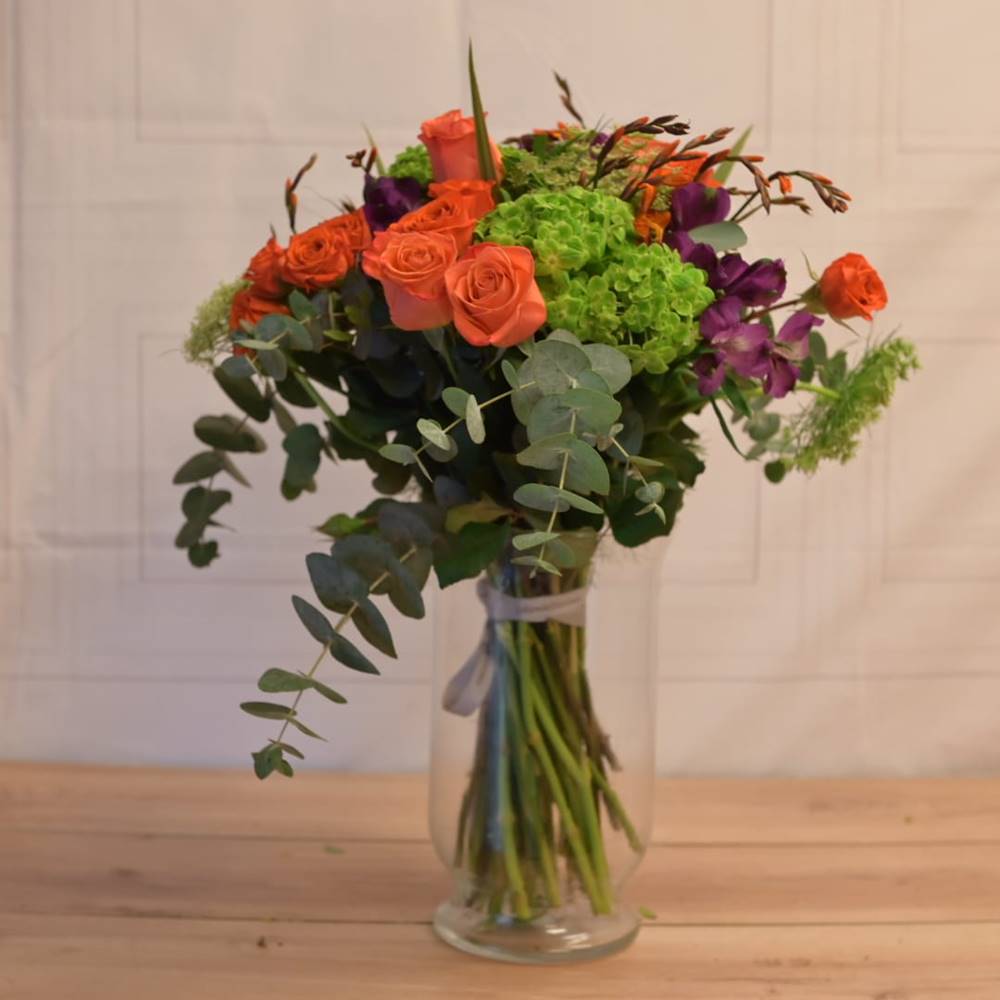 Nuestro ramo Alaia se compone de hortensias verdes, rosas naranjas, asltromelias moradas, crocosmía , ammi y verdes variados de temporada. Un ramo variados realizado en vibrantes colores que dan alegría y levantan el ánimo.