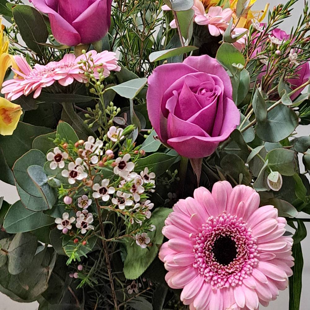 Este ramo combina flores de diferentes colores y texturas, simbolizando diversidad, alegría, vitalidad y frescura. Es perfecto para expresar cariño, felicitaciones, gratitud o simplemente para sorprender a alguien con un detalle floral vibrante y lleno de energía positiva.
