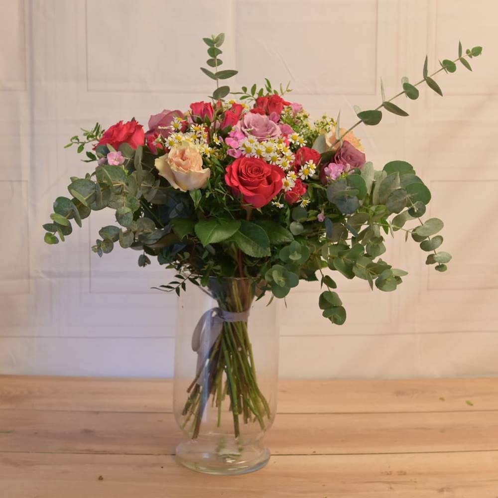Ramo con  rosas color rosa, fucsia  y lila, además de rosas spray color fucsia, tanacetum, phlox rosa y verdes de temporada,  El perfecto ramo para agradecer a un amigo o conocido.  Los tonos rosas simbolizan aprecio, confianza y agradecimiento.