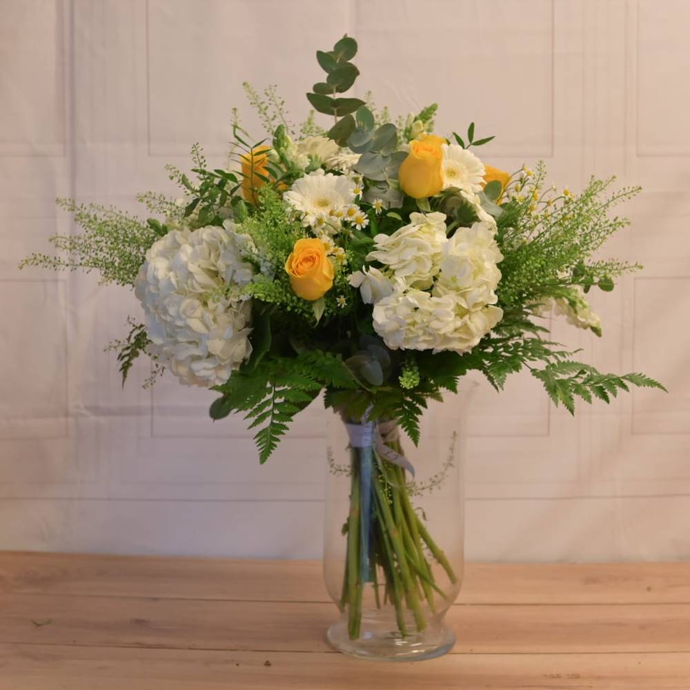 Ramo de variado en tonos blancos y amarillos compuesto de hortensias, rosas, gerberas mini, antirrinum, tanacetum y verdes variados de temporada.