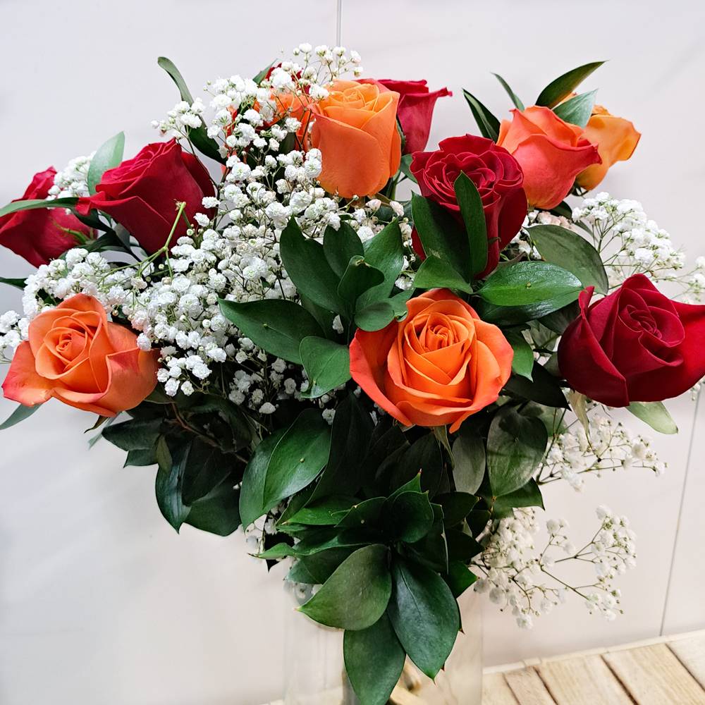 Las rosas rojas y naranjas simbolizan pasión, entusiasmo, amor y fuerza interior. Este ramo es ideal para expresar sentimientos intensos, celebrar logros, transmitir admiración o sorprender a alguien con un regalo que combina elegancia y energía. El ramo Sutan es perfecto para aniversarios, cumpleaños, celebraciones románticas o para momentos en los que quieras transmitir emociones profundas.
