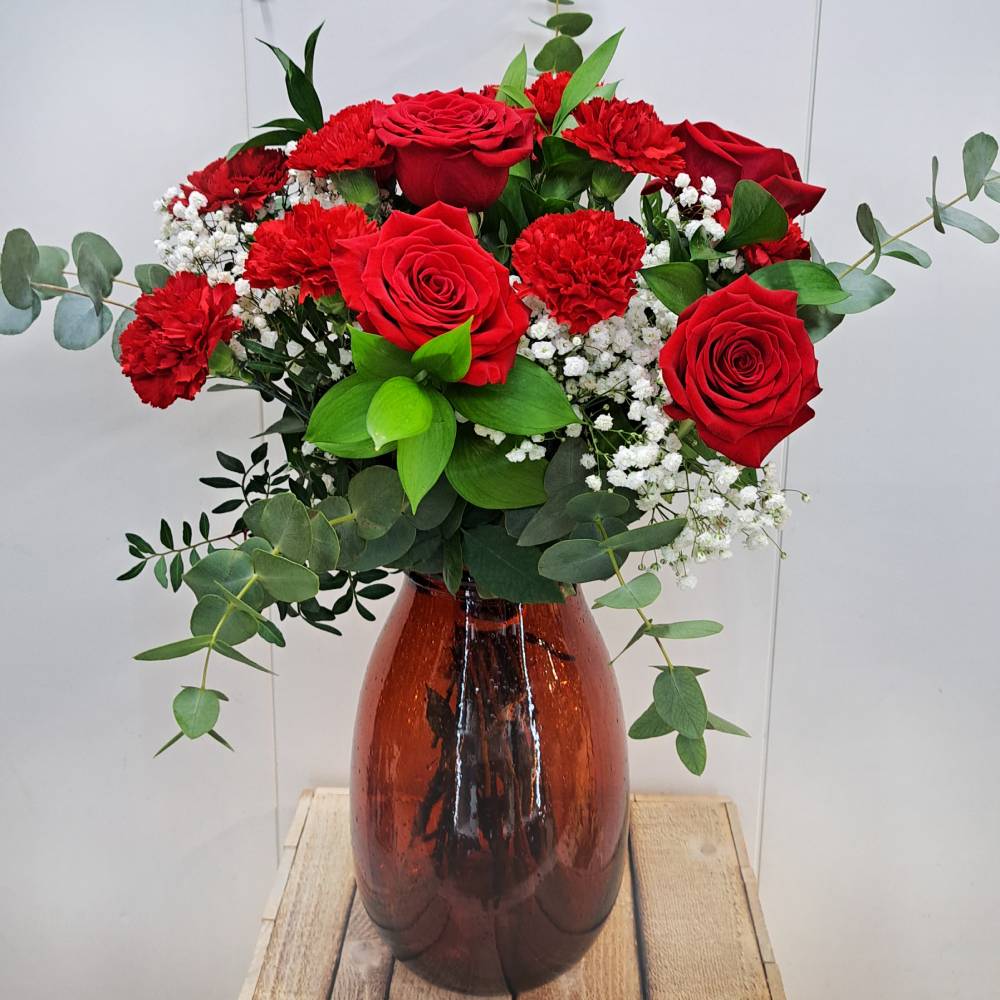 El ramo Laztan combina claveles rojos intensos y rosas rojas frescas, creando un arreglo equilibrado y muy romántico, perfecto para regalar o decorar.